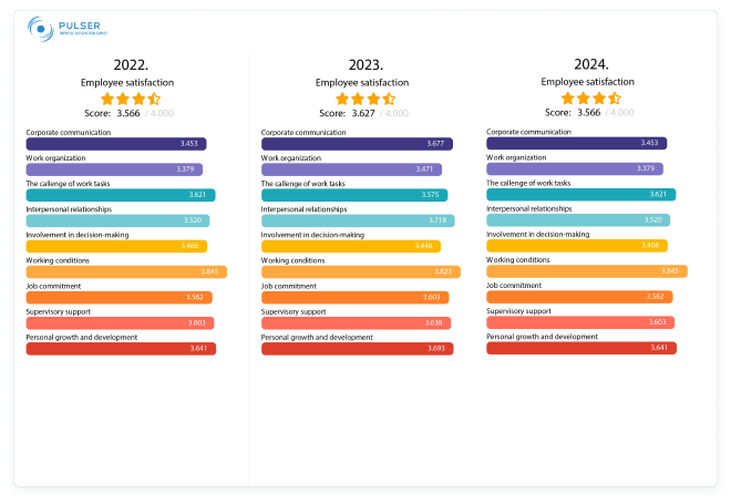 Po izvedenem raziskovanju boste prejeli strukturirane informacije od zaposlenih, ki vam bodo pomagale pri iskanju odgovorov na ključna vprašanja, ki prispevajo k izboljšanju upravljanja s človeškimi viri, povečanju angažiranosti in skupnemu zadovoljstvu zaposlenih. Z uporabo platforme PULSER boste dobili vpogled v sprožilce angažiranosti, ki vplivajo na raven učinkovitosti in zadržanja zaposlenih.